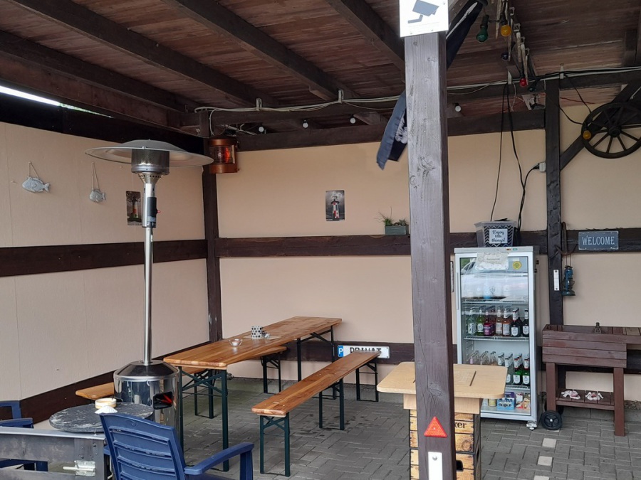 Rustiale Bierbank-Sitzecke unterm dekorierten Carport